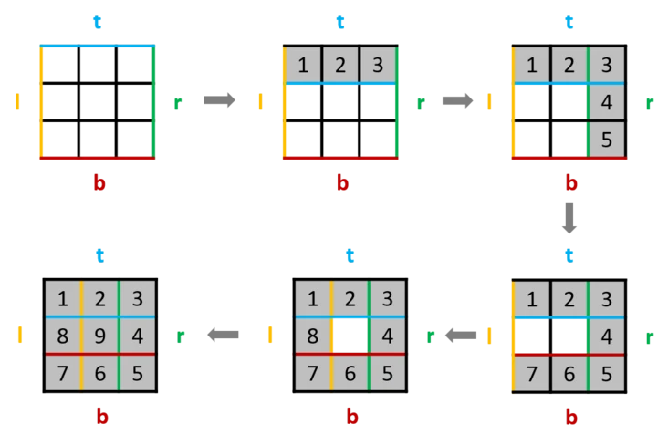1 2 3 4 5 6 7 8 9 10 11 12 13 14 15 16 17 18 19 20 21 22 23 24 25 26 27 28 29 30 31 32 33 class Solution { public List<Integer> spiralOrder (int [][] matrix) { int up = 0 ,down = matrix.length - 1 ; int left = 0 ,right = matrix[0 ].length - 1 ; List<Integer> list = new ArrayList<Integer>(); while (true ){ for (int i = left; i <= right; i++) { list.add(matrix[up][i]); } if (++up>down)break ; for (int i = up; i <= down; i++) { list.add(matrix[i][right]); } if (--right < left)break ; for (int i = right; i >= left ; i--) { list.add(matrix[down][i]); } if (--down < up)break ; for (int i = down; i >= up ; i--) { list.add(matrix[i][left]); } if (++left > right)break ; } return list; } }
